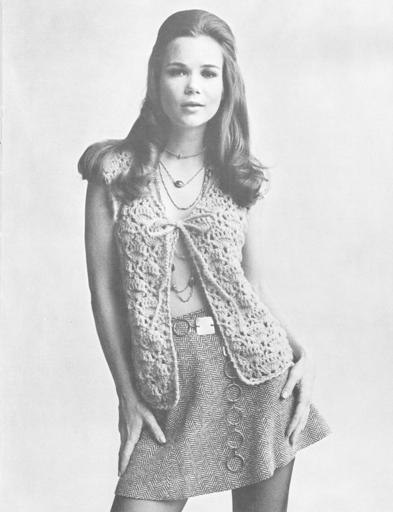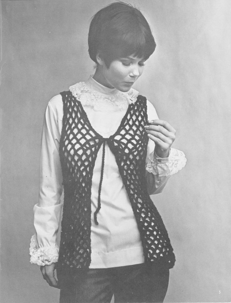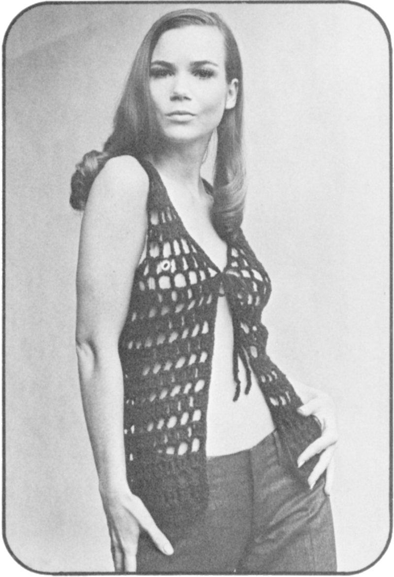 | Sew shoulder seams. Fasten off ends. Make a tie by chaining desired length in chain st. Work 1 row of sc around piece. Work 1 row of sc around armholes. | |