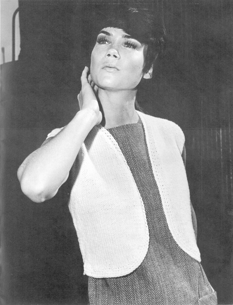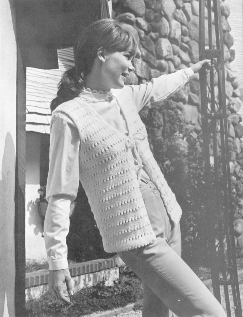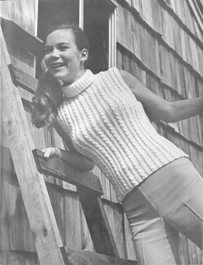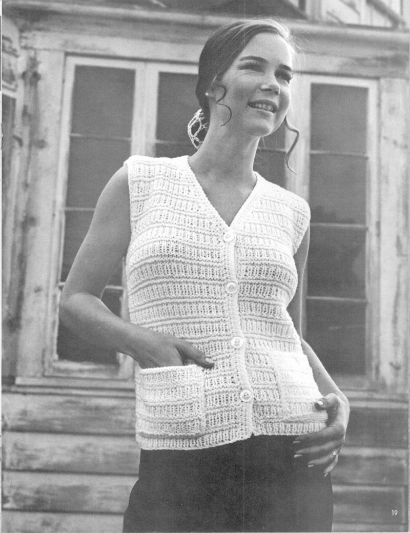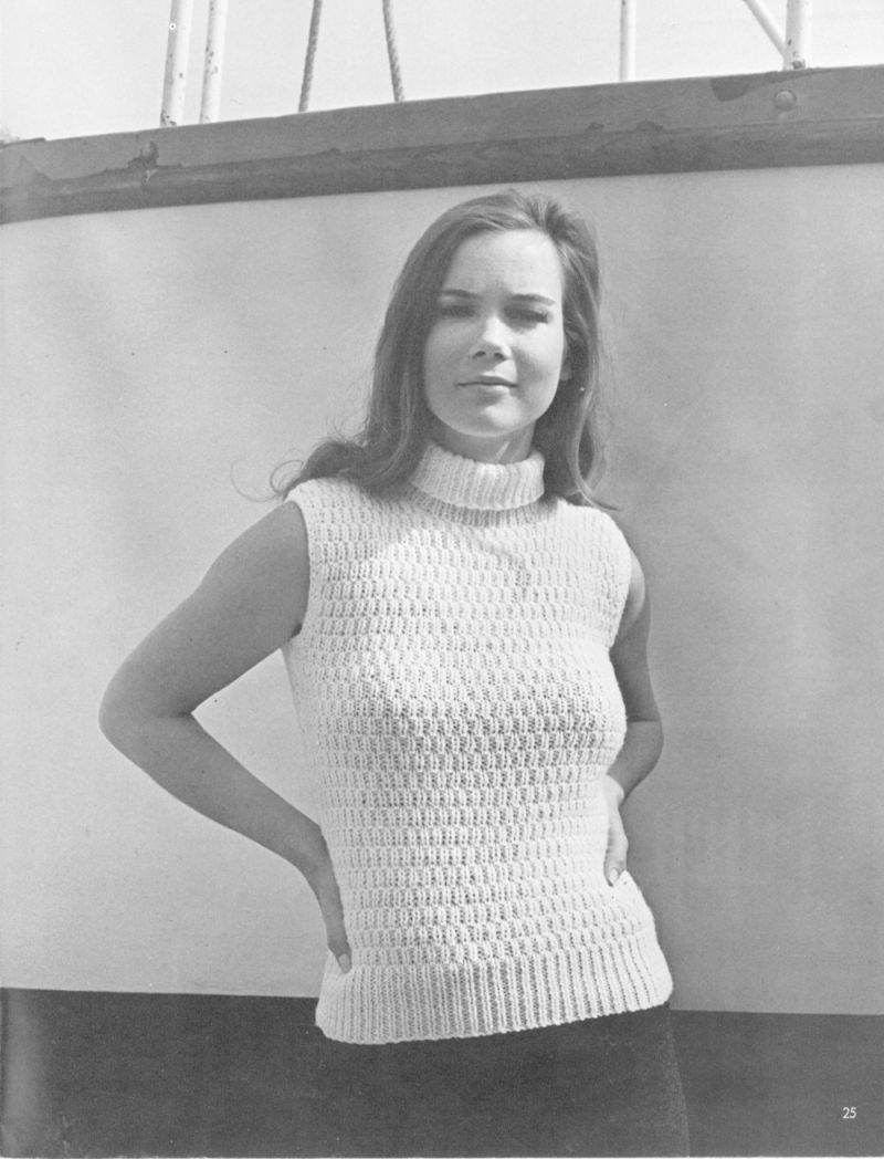 | With #6 needles cast on 72 sts. work in ribbing of K1, P1 for 4 inches. Change to #8 needles, knit 1 row, purl 1 row to underarm, 14 inches. Bind off 2 sts. each side then K2, slip 1, K1, pass slip st. over. Work to last 4 sts. K2 tog. K2, Purl back. | |