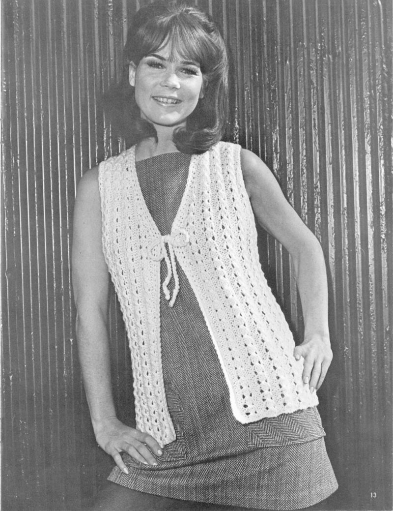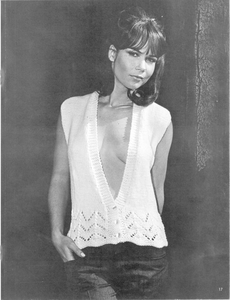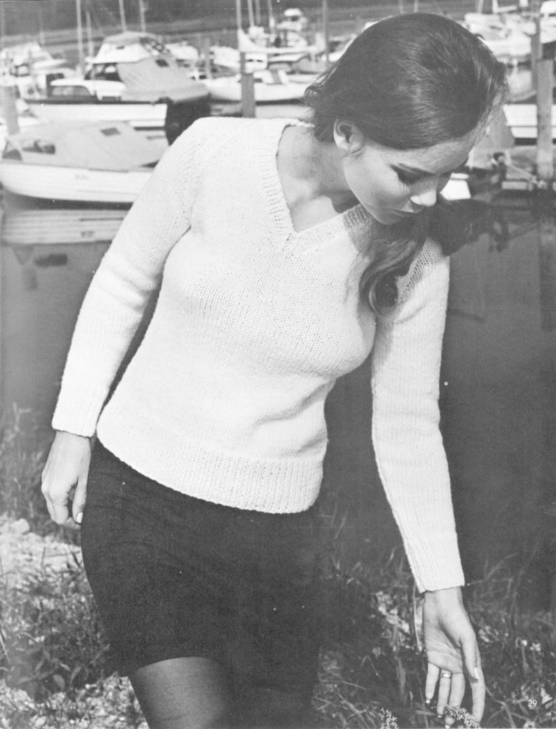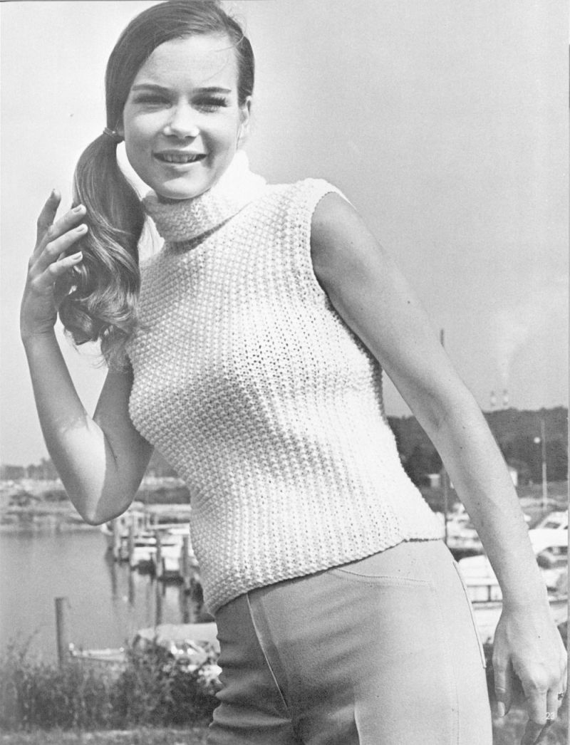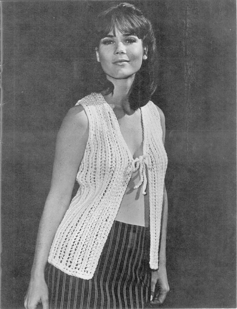 | With #6 needles cast on 72 sts. work in ribbing of K1, P1 for 4 inches. Change to #8 needles, knit 1 row, purl 1 row to underarm, 14 inches. Bind off 2 sts. each side then K2, slip 1, K1, pass slip st. over. Work to last 4 sts. K2 tog. K2, Purl back. | |