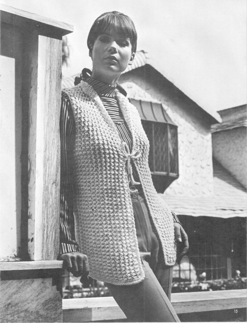 | Cast on 64 sts. knit 1 row, purl 1 row, increasing 1 st. each side every 4th row 4 times. Work to underarm 7 inches. Bind off 4 sts. each side, then K2 tog. each side every other row 4 times. Work even until armhole measures 8 inches. Bind off 9 sts. at the beginning of each row twice each side. Bind off. | |