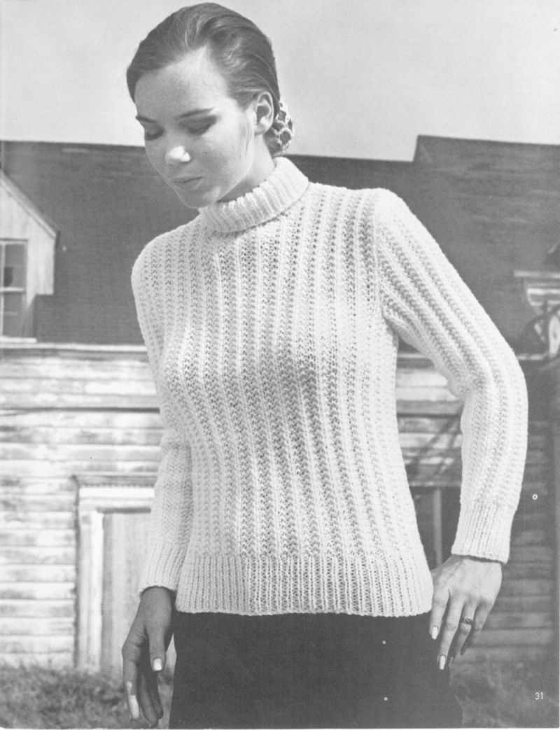 | Front turtle collar—with #6 needles on right side of work pick up 50 sts. from shoulder to shoulder, work in ribbing of K1, P1 for 6 inches. |