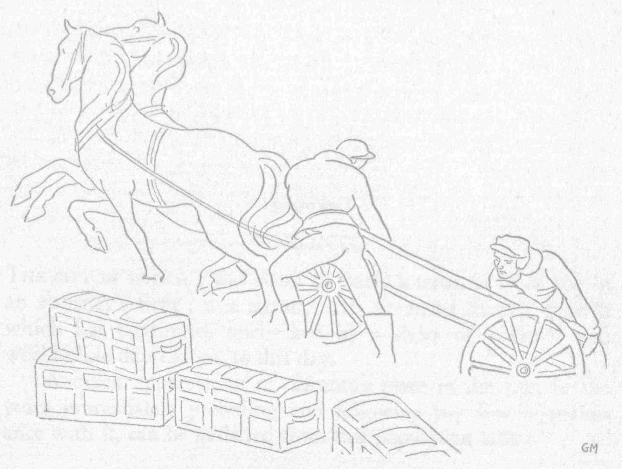 The peddling wagon was as familiar a part of the country scene as the delivery van of the big stores is in cities today. The itinerant merchant would drive to Toronto and stock his wagon with certain staples, smallwares, hardware, cloth in bolts and even clothing, such as overalls and work shirts. Being mobile, he could suit his small stock to the seasons. Then he would drive the long road back to his familiar territory, and visit the farms, particularly those at a distance from the villages, or those occupied by families tied by numerous children or other circumstances to their work. He was always welcome. Many a farm wife watched for his coming, with his travelling store, as the modern farm wife watches for the arrival of the resplendent mail order catalogue today. The mobile merchant was invited to dinner wherever it befell in his travels, and stopped the night with old friends along the way.