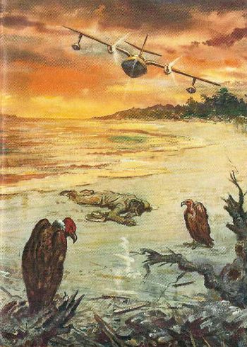 ‘We’ll look for them later,’ decided Biggles. ‘I’m tired, so I shall go straight in.’ He held on towards a small, dilapidated-looking structure, forlorn and lonely, that stood back a short distance from the waveless edge of the black water. It stood on sandy soil near a solitary leafless tree that provided a perch for several hunchbacked vultures.