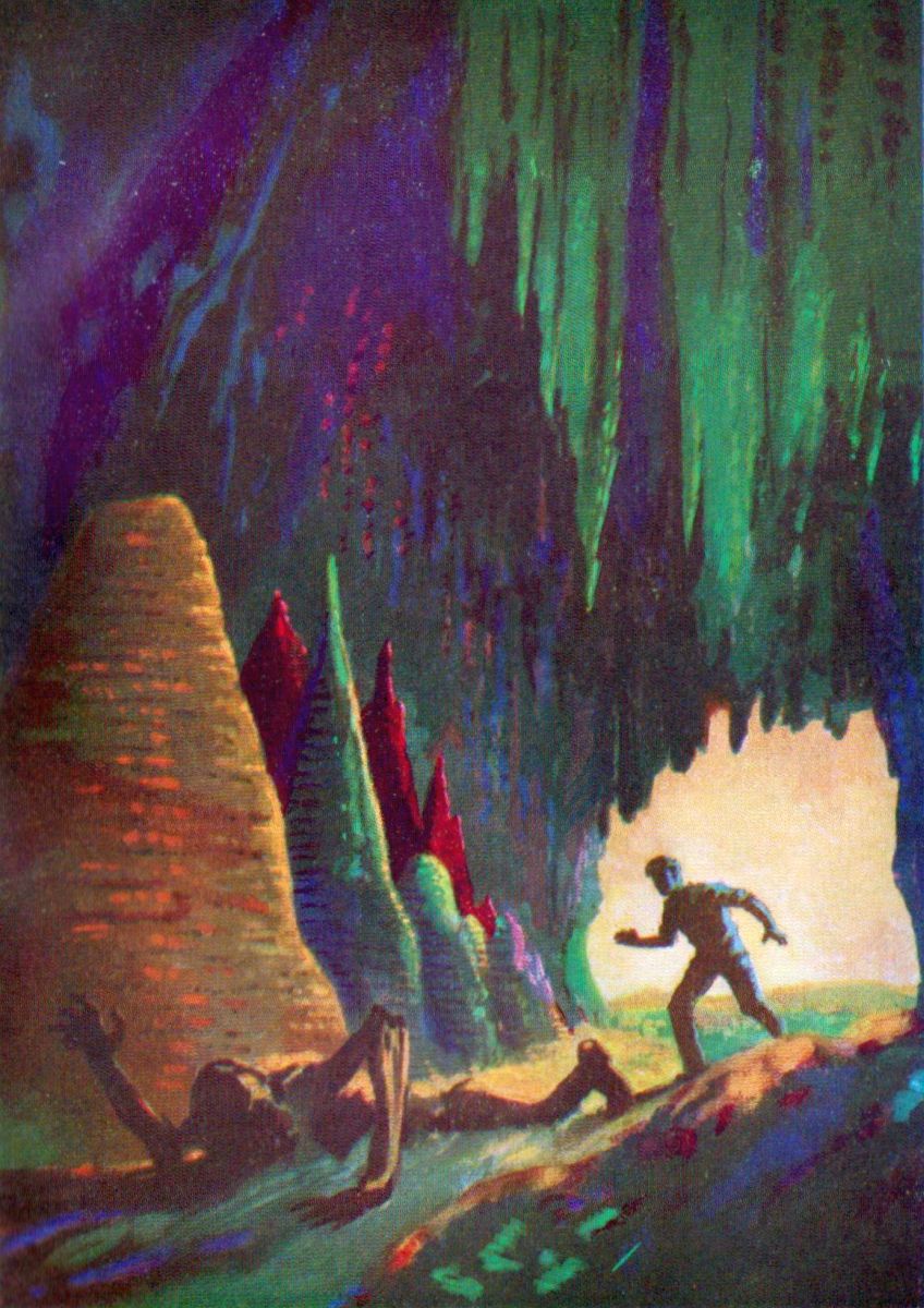 In Return to Mars they go back, taking a doctor friend, and by spraying an insecticide on the canals round the chief city (which for want of a name they call Utopia), from which the mosquitoes rise, they succeed in saving the life of a man named Vargo. He is much like themselves in appearance, having developed on similar lines to the men of Earth; but the Martian civilization being much older, and life generally longer, he has some remarkable accomplishments, one of which, by comparison, is an abnormally high degree of intelligence. This enables him to speak the language of his rescuers very quickly, and he narrates the legendary story of his people. He tells them of the disaster that destroyed Kraka, brought about, it was thought, by an atomic experiment that went wrong. The explosion not only fragmentated Kraka but affected every planet in the Solar System. All were thrown out of their orbits. The surface of Mars was swept flat, the only survivors being the crews of their Remote Interplanetary Squadron which happened to be in Outer Space at the time.