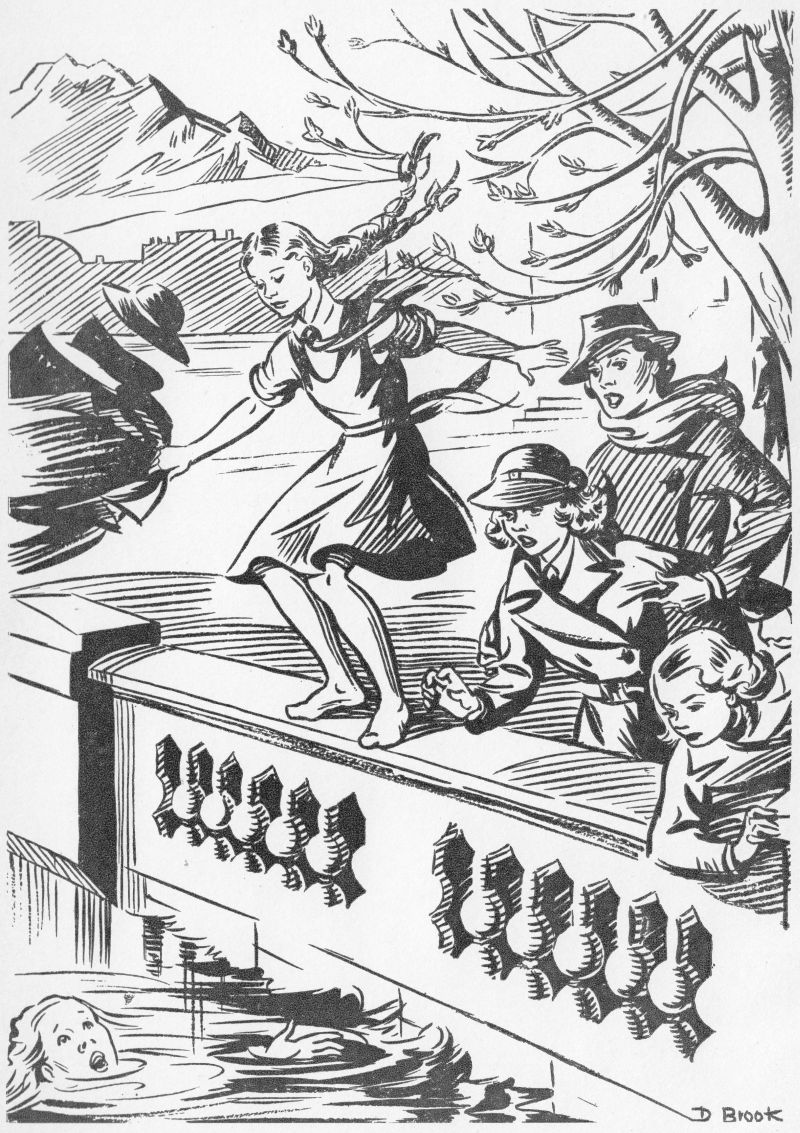 Prunella wrenched off her coat and, before anyone could prevent her, had climbed the railings and dived . . .
