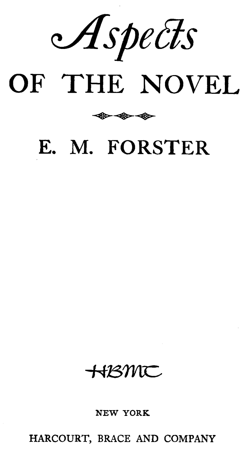 These are some lectures (the Clark lectures) which were delivered under the auspices of Trinity College, Cambridge, in the spring of 1927. They were informal, indeed talkative, in their tone, and it seemed safer when presenting them in book form not to mitigate the talk, in case nothing should be left at all. Words such as “I,” “you,” “one,” “we,” “curiously enough,” “so to speak,” “only imagine,” and “of course” will consequently occur on every page and will rightly distress the sensitive reader; but he is asked to remember that if these words were removed others, perhaps more distinguished, might escape through the orifices they left, and that since the novel is itself often colloquial it may possibly withhold some of its secrets from the graver and grander streams of criticism, and may reveal them to backwaters and shallows.