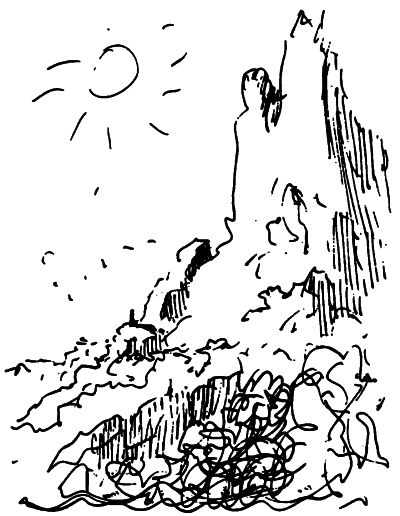 Sepulchrave dead? And a new Earl—a child not two years old? Surely the very stones of the castle would have passed the message up, or the Bright Carvings have mouthed the secret to him. From the toyland of figures and horses and paths and trees and rocks and from the glimpse of a green reflection in the lake the size of a stamp, arose, of a sudden, the cry of an old voice, cruel, even in its remoteness, and then the silence of the figures moving on, broken by an occasional minutiae of sound as of a tin-tack falling on a brick, as a hoof struck a stone; a bridle creaked with the voice of a gnat, and Rottcodd stared from his eyrie as the figures moved on and on towards the base of the Castle, each with a short black shadow sewn to its heels. The terrain about them was as though freshly painted, or rather, as though like an old landscape that had grown dead and dull it had been varnished and now shone out anew, each fragment of the enormous canvas, pristine, the whole, a glory.