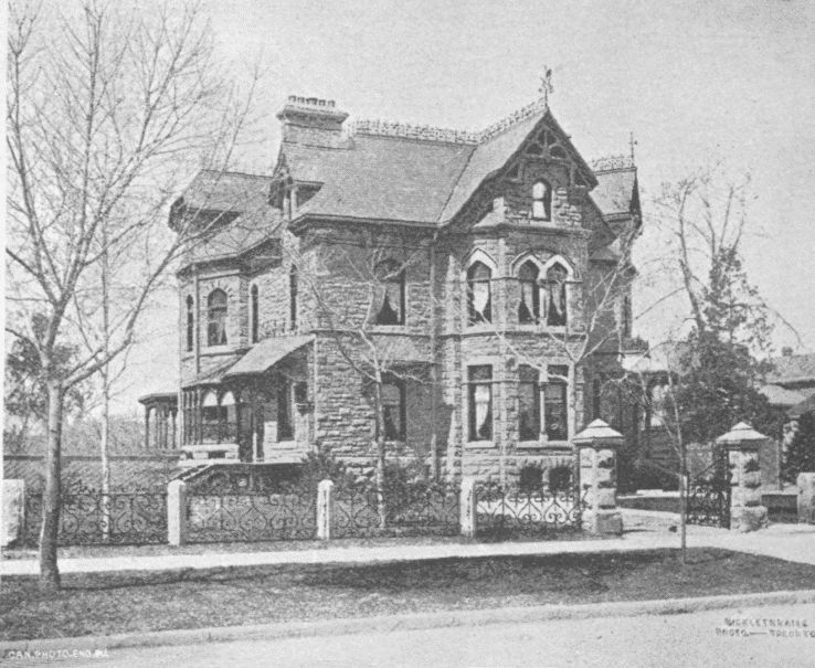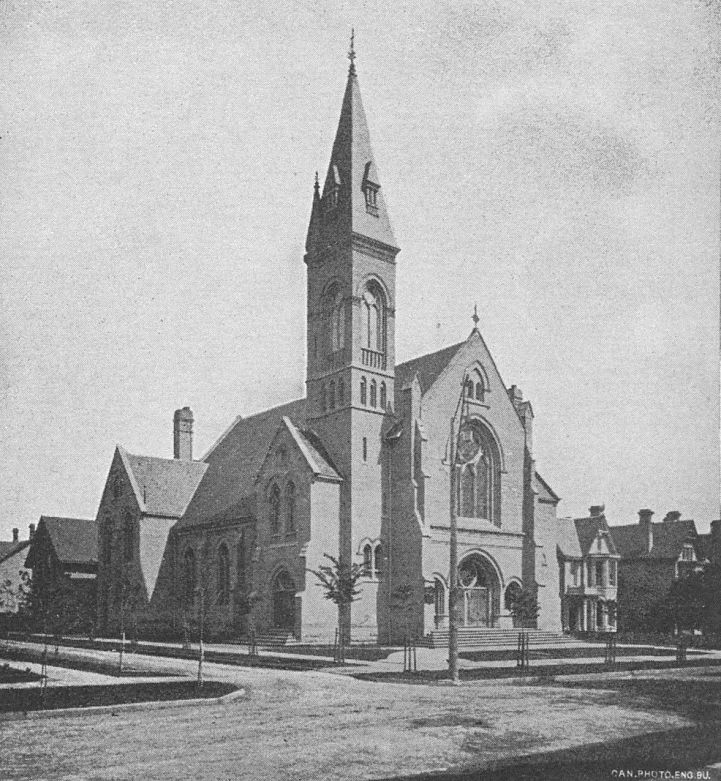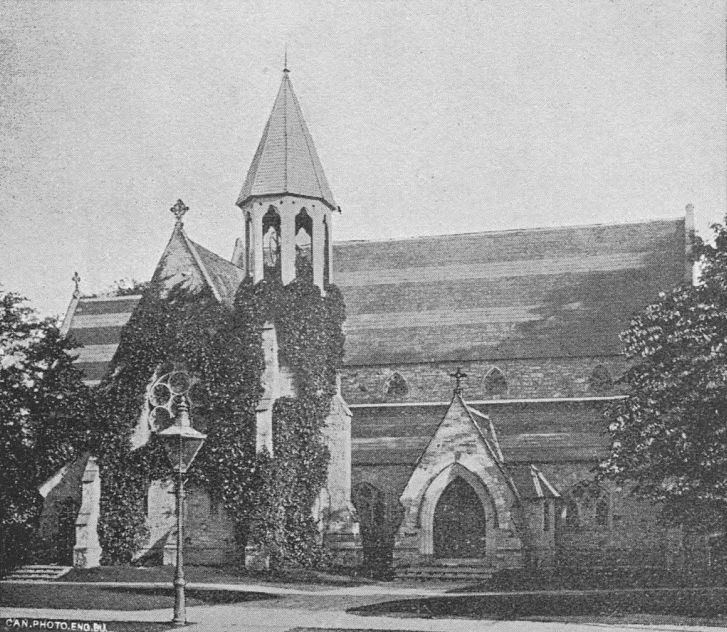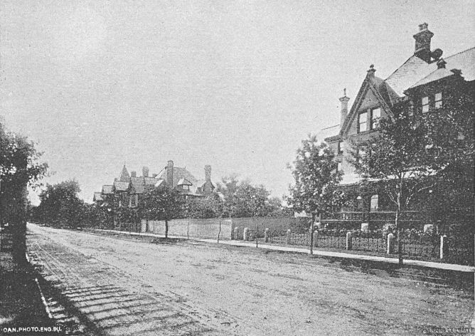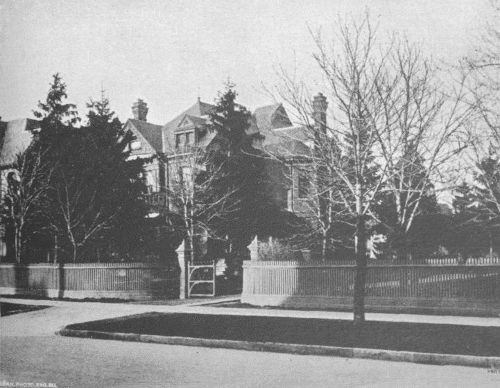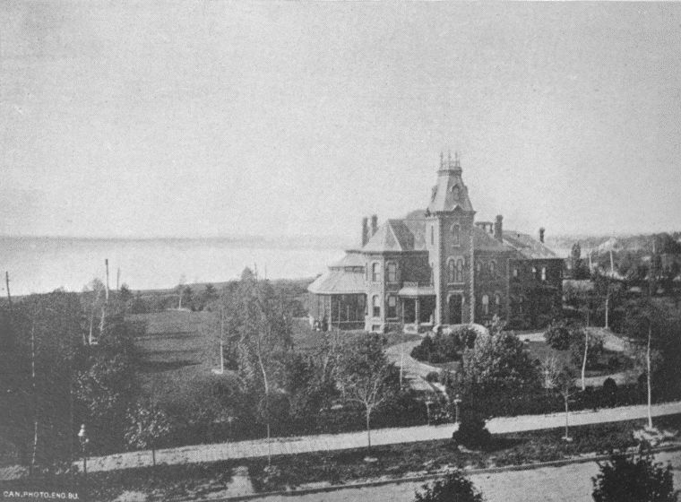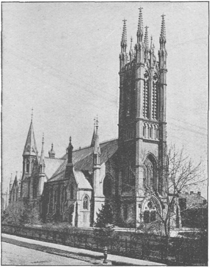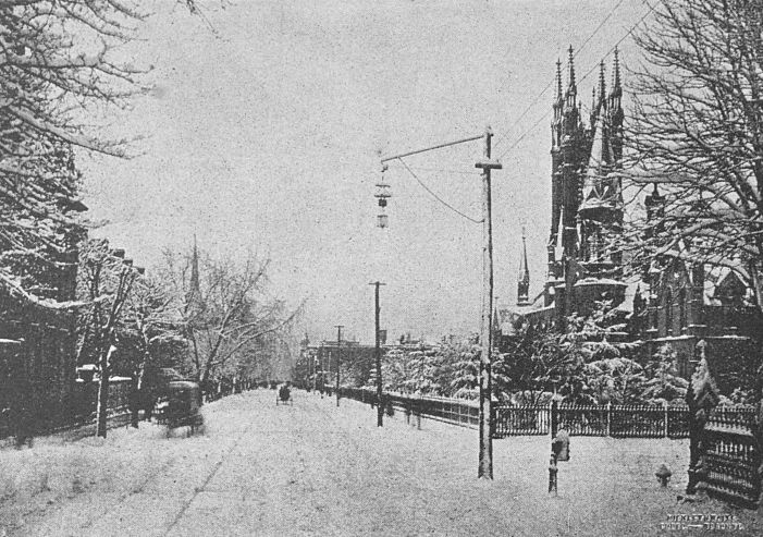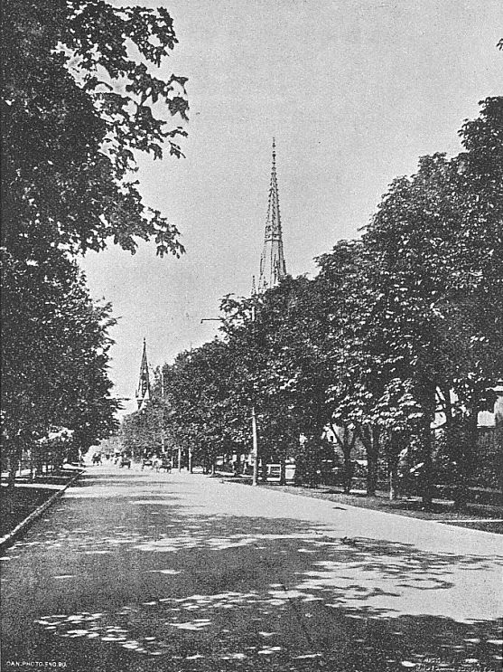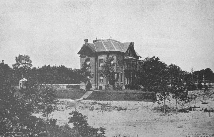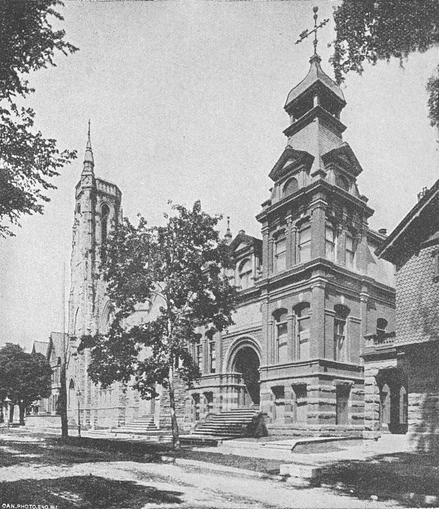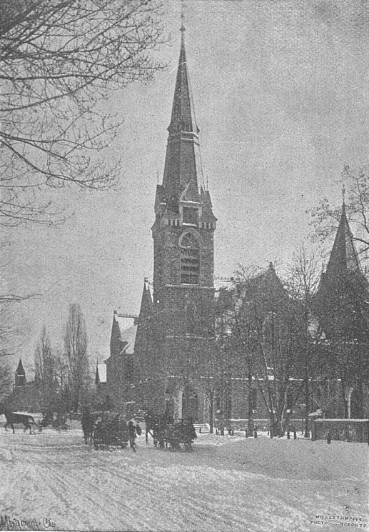 Happily for Toronto, the town was from the first laid out, like Philadelphia and Washington, in accordance with the theories of the idealists, and it has had scarcely anything to correct in its general ground-plan, which was simply that of a parallelogram divided into parts by straight streets, generally sixty-six feet in width, running east and west, traversed by straight streets of about the same width, running north and south. Its site—a widely-extended, gently sloping plain—admitted of this, and from the time of its first projection, in 1793, on a very modest scale hard by the outlet of the River Don, to the present, when, through a populous suburb and a park, the munificent gift of the late Mr. Howard, its borders all but touch the Humber, some six miles westward of the starting-point, the germ-idea of the place has not been materially departed from. One thoroughfare north and south was staked out on the Toronto plain, some fifty years ago, of the exceptional width of one hundred and thirty-two feet, but grave persons of the period shook their heads and pronounced the notion extravagant and even visionary. It has come to pass, nevertheless, that this thoroughfare is a reality, and its width is not considered now as being anything especially out-of-the-way for a street which seems likely to be in the future the axis of Toronto, its dividing line into east and west. Unfavourable to the picturesque as is the parallelogram arrangement of streets in theory, in practice a good deal of impressiveness often results therefrom, and even beauty, so long as the roadways are wide and the building-lots continue to be spacious. Fine vistas are secured, and in certain localities the array of comfortable residences coming in quick succession on both sides is a sight quite pleasant to see. The free currents of pure air, too, which this arrangement permits, and the facilities which it affords for a good system of sewers, are points in its favour. Their city planned from the beginning on ideal lines, the inhabitants as their riches have increased have shown themselves well inclined to give some play to the ideal in several respects. Their churches, for example, have become very numerous, and quite sumptuous. From several points of view, the sky-line is agreeably varied by the spires, towers, gables, turrets and pinnacles appertaining to these, while, below, the buildings themselves are most of them good specimens of style and substantial masonry, with extensive grounds surrounding them in several instances, tastefully planted and carefully kept; the church itself consisting not merely of a solitary temple, as formerly, but of a cluster of apartments or halls, all of them rendered necessary by the exigencies of the church life revived everywhere in these days—schools, lecture-rooms, class-rooms and libraries, to say nothing of appliances in some of them for the more convenient furnishing forth of acceptable mundane refreshments to large social gatherings on festive occasions.