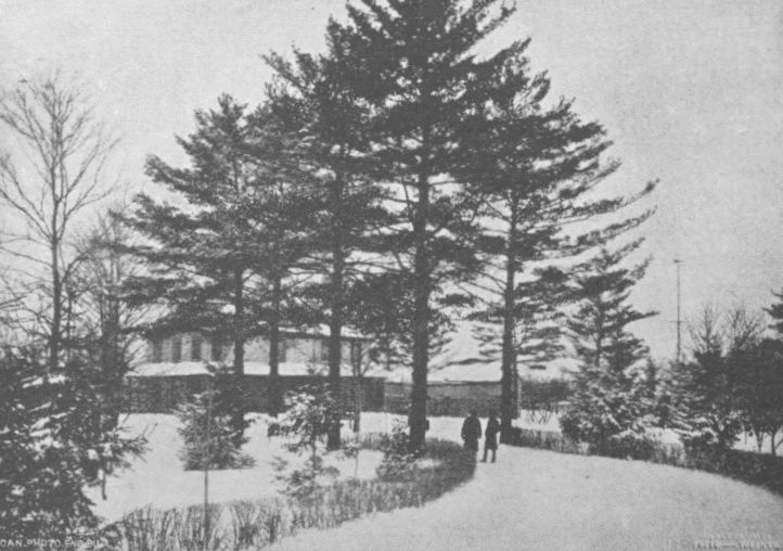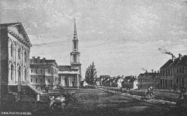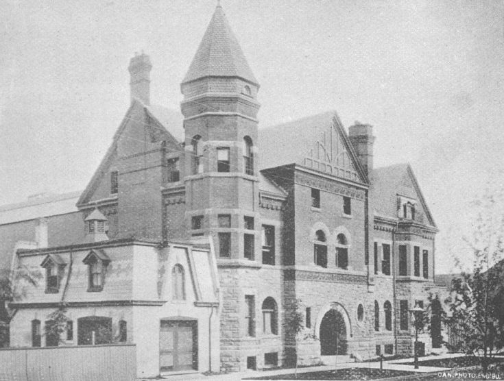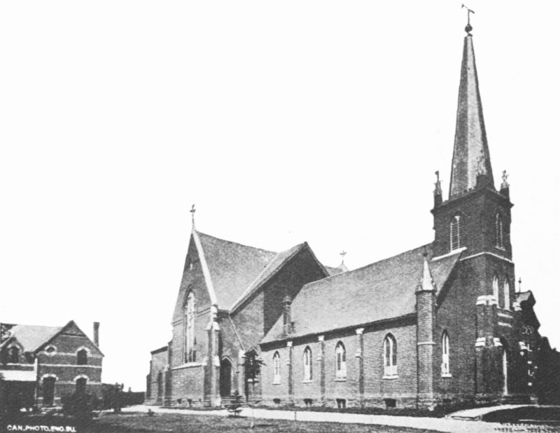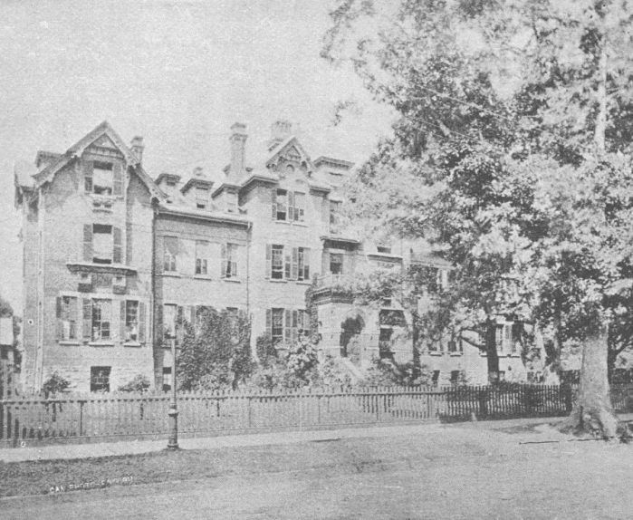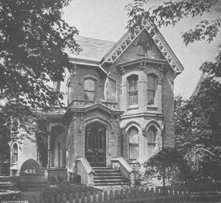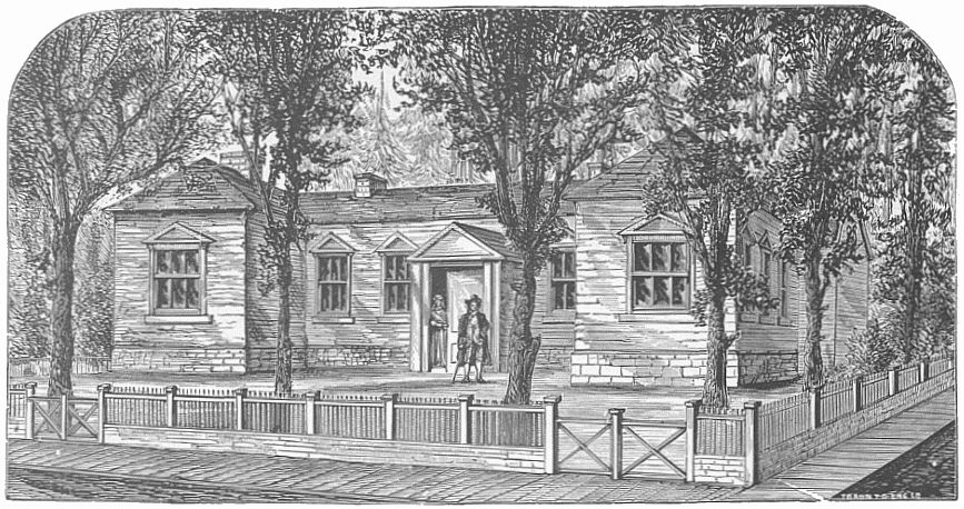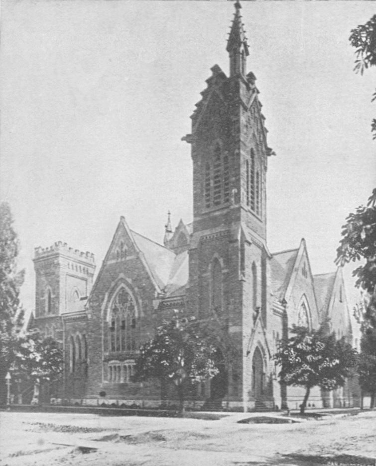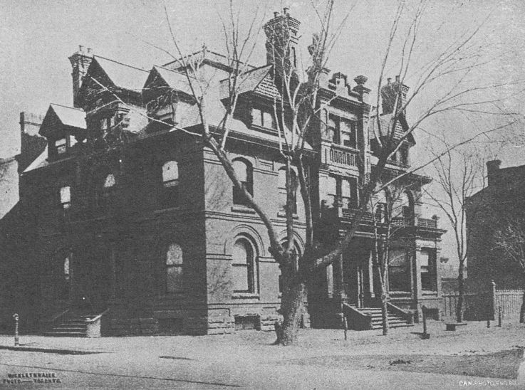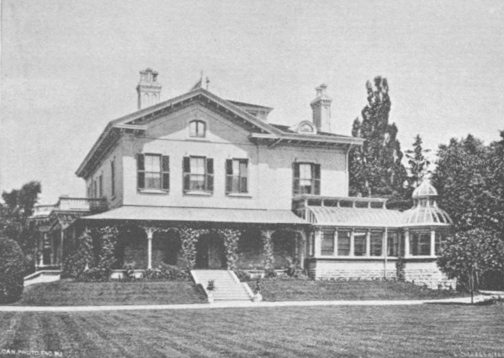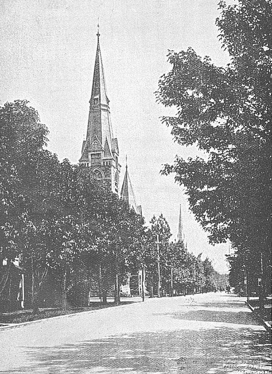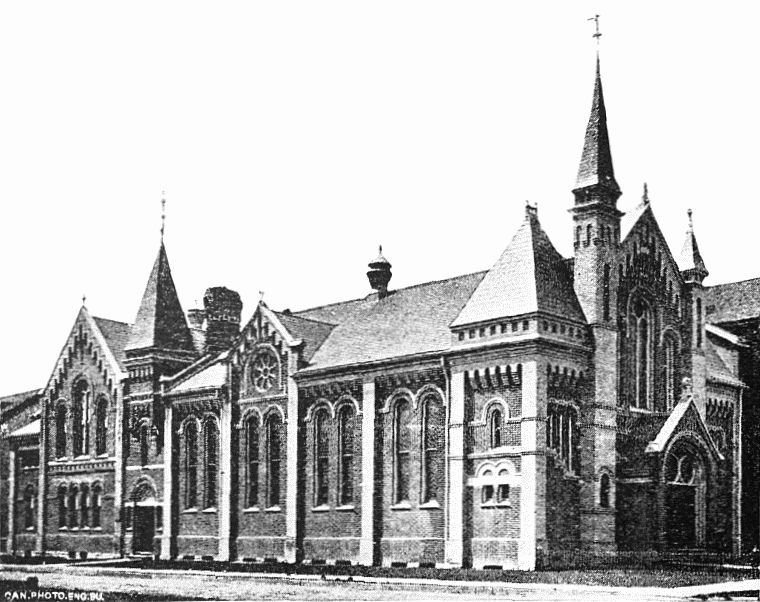 Happily for Toronto, the town was from the first laid out, like Philadelphia and Washington, in accordance with the theories of the idealists, and it has had scarcely anything to correct in its general ground-plan, which was simply that of a parallelogram divided into parts by straight streets, generally sixty-six feet in width, running east and west, traversed by straight streets of about the same width, running north and south. Its site—a widely-extended, gently sloping plain—admitted of this, and from the time of its first projection, in 1793, on a very modest scale hard by the outlet of the River Don, to the present, when, through a populous suburb and a park, the munificent gift of the late Mr. Howard, its borders all but touch the Humber, some six miles westward of the starting-point, the germ-idea of the place has not been materially departed from. One thoroughfare north and south was staked out on the Toronto plain, some fifty years ago, of the exceptional width of one hundred and thirty-two feet, but grave persons of the period shook their heads and pronounced the notion extravagant and even visionary. It has come to pass, nevertheless, that this thoroughfare is a reality, and its width is not considered now as being anything especially out-of-the-way for a street which seems likely to be in the future the axis of Toronto, its dividing line into east and west. Unfavourable to the picturesque as is the parallelogram arrangement of streets in theory, in practice a good deal of impressiveness often results therefrom, and even beauty, so long as the roadways are wide and the building-lots continue to be spacious. Fine vistas are secured, and in certain localities the array of comfortable residences coming in quick succession on both sides is a sight quite pleasant to see. The free currents of pure air, too, which this arrangement permits, and the facilities which it affords for a good system of sewers, are points in its favour. Their city planned from the beginning on ideal lines, the inhabitants as their riches have increased have shown themselves well inclined to give some play to the ideal in several respects. Their churches, for example, have become very numerous, and quite sumptuous. From several points of view, the sky-line is agreeably varied by the spires, towers, gables, turrets and pinnacles appertaining to these, while, below, the buildings themselves are most of them good specimens of style and substantial masonry, with extensive grounds surrounding them in several instances, tastefully planted and carefully kept; the church itself consisting not merely of a solitary temple, as formerly, but of a cluster of apartments or halls, all of them rendered necessary by the exigencies of the church life revived everywhere in these days—schools, lecture-rooms, class-rooms and libraries, to say nothing of appliances in some of them for the more convenient furnishing forth of acceptable mundane refreshments to large social gatherings on festive occasions.