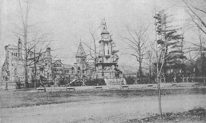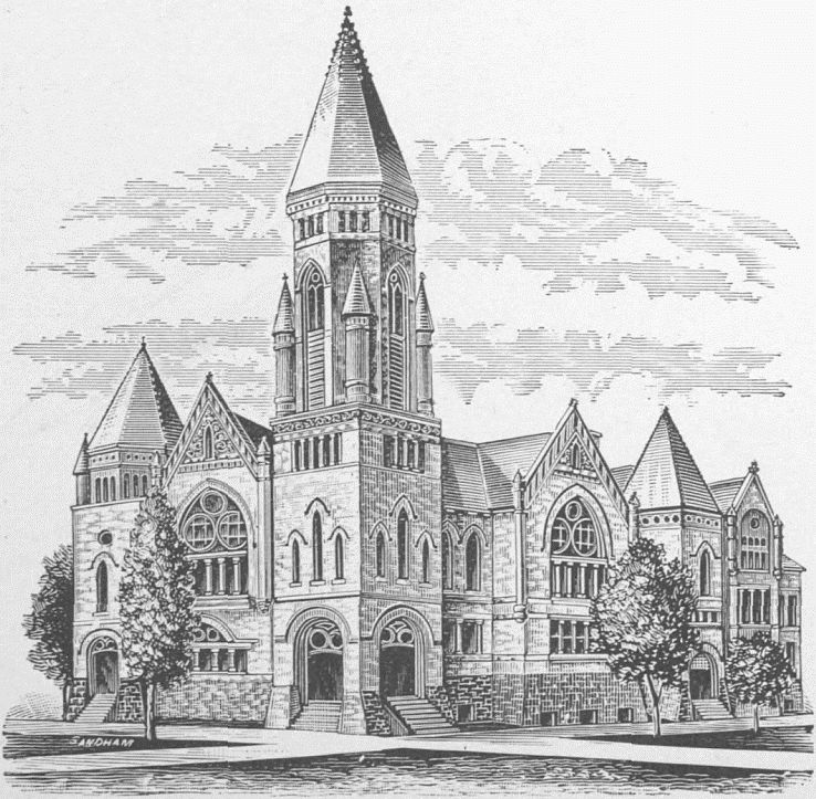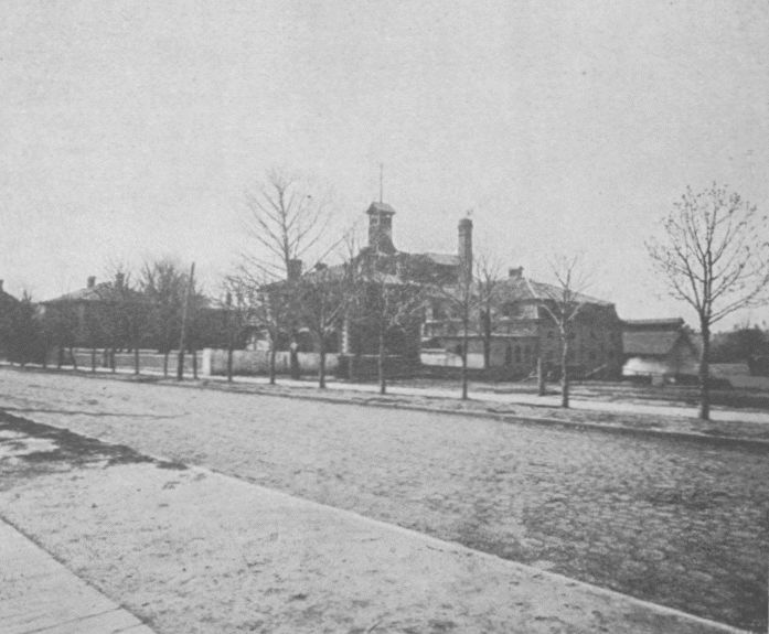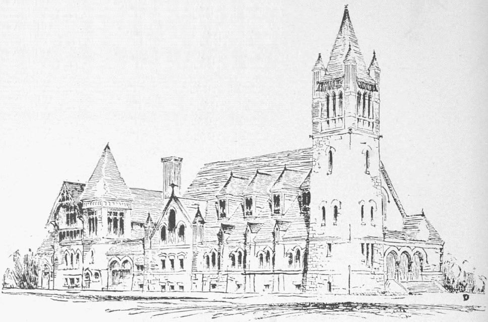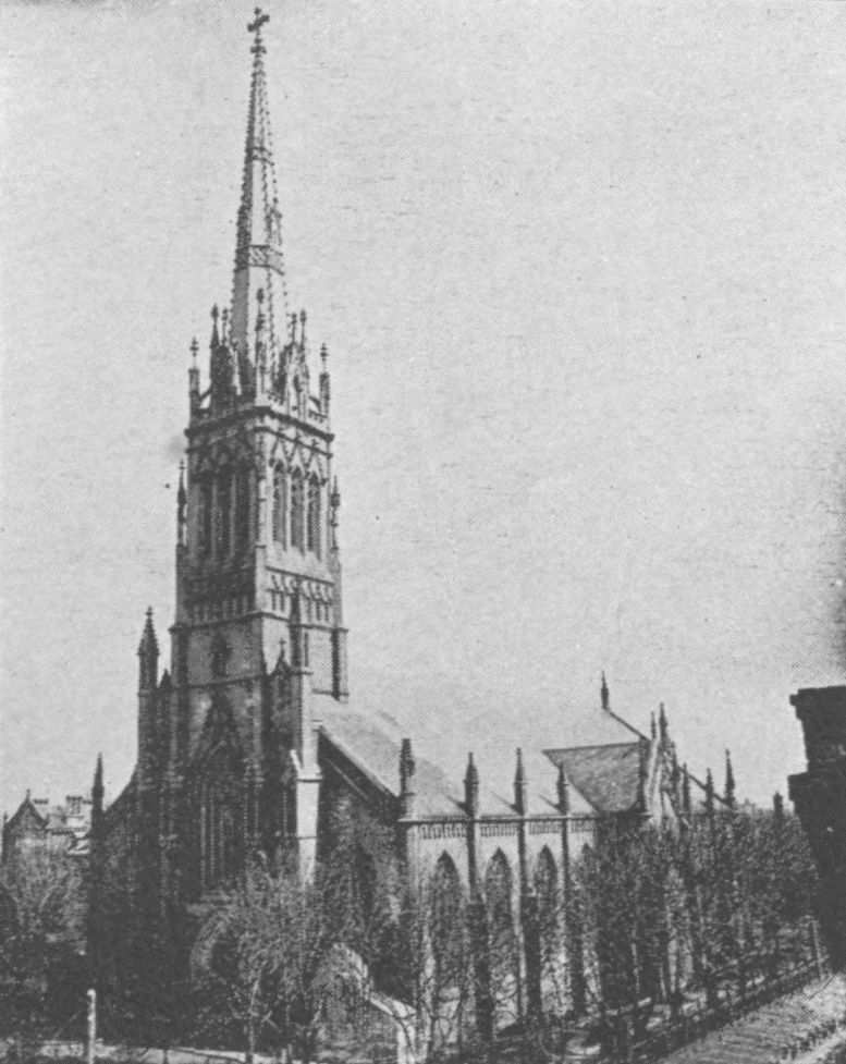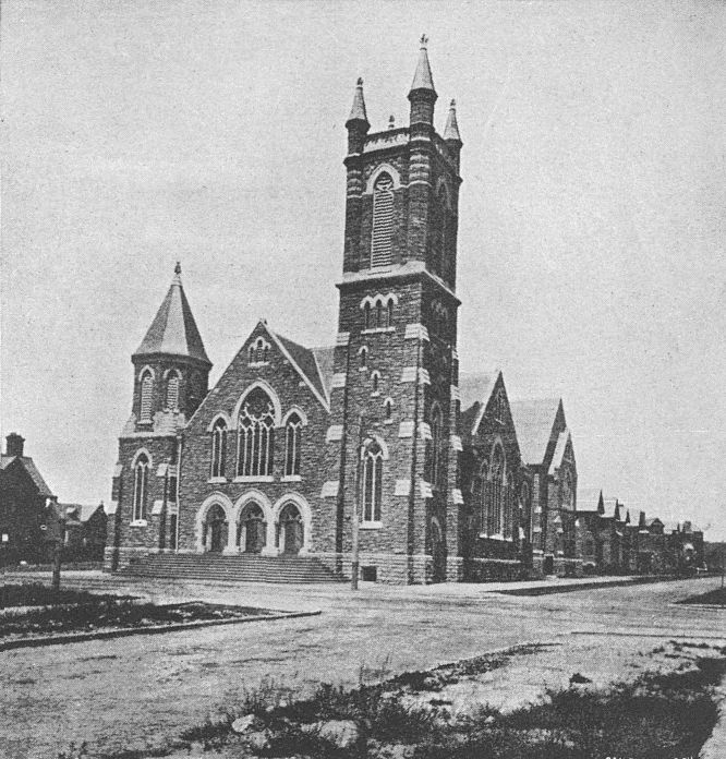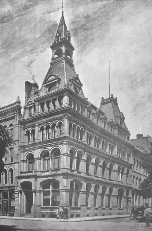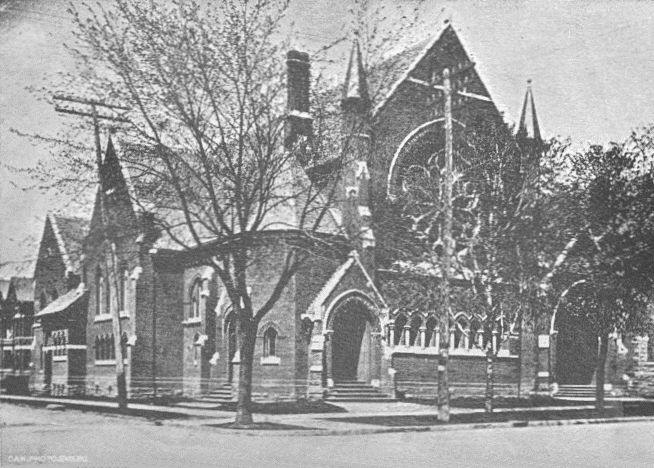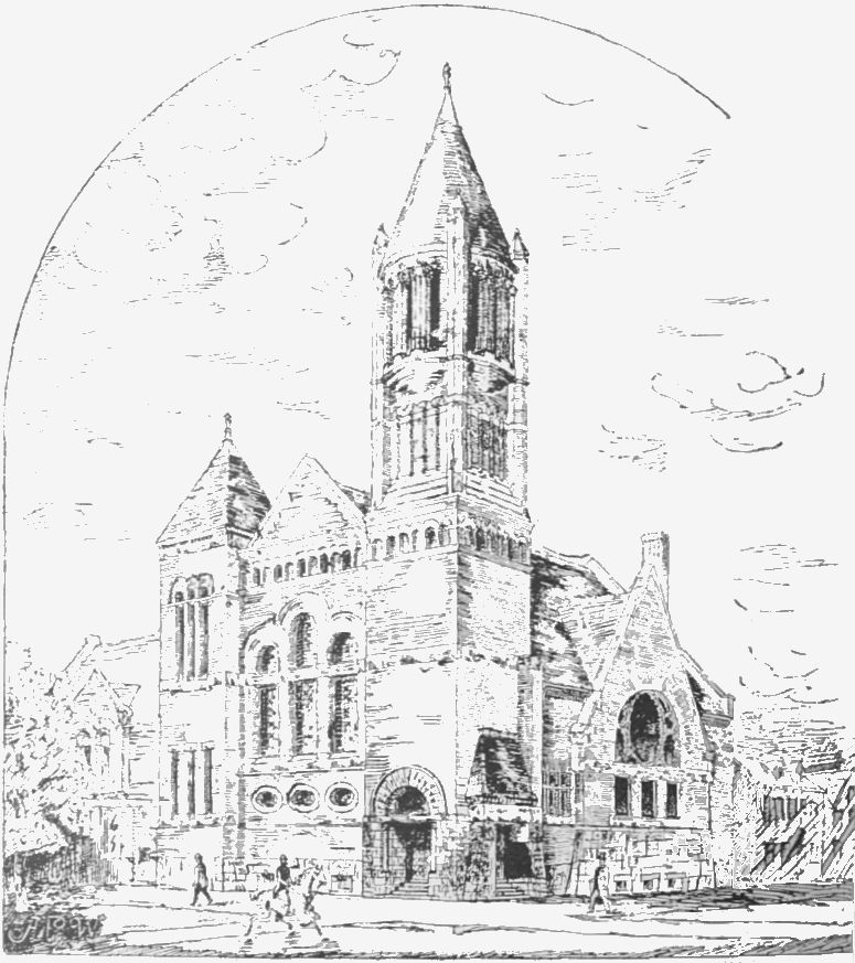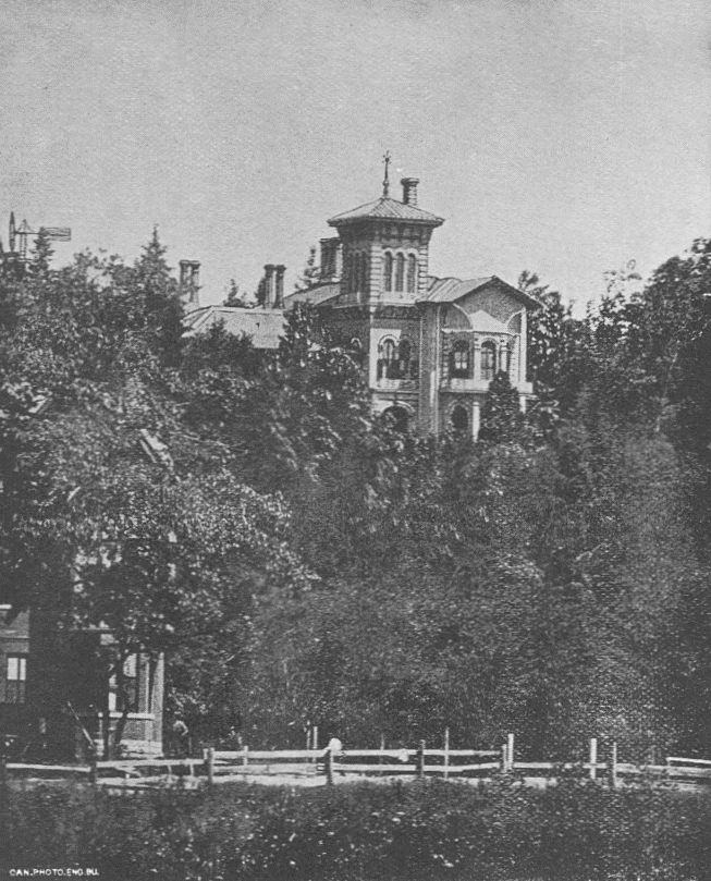 Happily for Toronto, the town was from the first laid out, like Philadelphia and Washington, in accordance with the theories of the idealists, and it has had scarcely anything to correct in its general ground-plan, which was simply that of a parallelogram divided into parts by straight streets, generally sixty-six feet in width, running east and west, traversed by straight streets of about the same width, running north and south. Its site—a widely-extended, gently sloping plain—admitted of this, and from the time of its first projection, in 1793, on a very modest scale hard by the outlet of the River Don, to the present, when, through a populous suburb and a park, the munificent gift of the late Mr. Howard, its borders all but touch the Humber, some six miles westward of the starting-point, the germ-idea of the place has not been materially departed from. One thoroughfare north and south was staked out on the Toronto plain, some fifty years ago, of the exceptional width of one hundred and thirty-two feet, but grave persons of the period shook their heads and pronounced the notion extravagant and even visionary. It has come to pass, nevertheless, that this thoroughfare is a reality, and its width is not considered now as being anything especially out-of-the-way for a street which seems likely to be in the future the axis of Toronto, its dividing line into east and west. Unfavourable to the picturesque as is the parallelogram arrangement of streets in theory, in practice a good deal of impressiveness often results therefrom, and even beauty, so long as the roadways are wide and the building-lots continue to be spacious. Fine vistas are secured, and in certain localities the array of comfortable residences coming in quick succession on both sides is a sight quite pleasant to see. The free currents of pure air, too, which this arrangement permits, and the facilities which it affords for a good system of sewers, are points in its favour. Their city planned from the beginning on ideal lines, the inhabitants as their riches have increased have shown themselves well inclined to give some play to the ideal in several respects. Their churches, for example, have become very numerous, and quite sumptuous. From several points of view, the sky-line is agreeably varied by the spires, towers, gables, turrets and pinnacles appertaining to these, while, below, the buildings themselves are most of them good specimens of style and substantial masonry, with extensive grounds surrounding them in several instances, tastefully planted and carefully kept; the church itself consisting not merely of a solitary temple, as formerly, but of a cluster of apartments or halls, all of them rendered necessary by the exigencies of the church life revived everywhere in these days—schools, lecture-rooms, class-rooms and libraries, to say nothing of appliances in some of them for the more convenient furnishing forth of acceptable mundane refreshments to large social gatherings on festive occasions.
