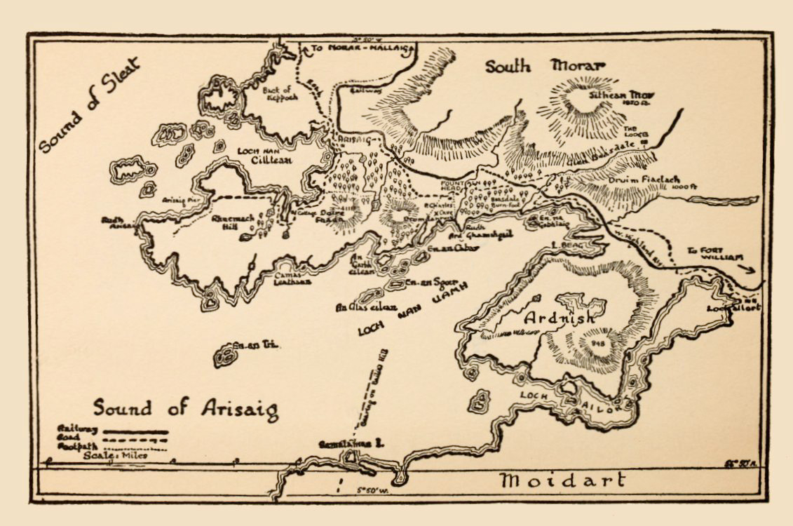 “All right. We came from the Baltic round through the Minch. It began to blow as we came down outside Skye. Came down to Arisaig, and the steamer stood off. Seemed calmer. That’s where we were cheated. Ran into the loch on a launch, myself and two other Reds, with the money in a stout steel box. There was a bit of the wind up on the part of my beauties about where we were to land. Result, we piled up on the rocks between An Glas Eilean and Eilean an Sgòrr, or else in the little islands to the north-east of An Sgòrr.