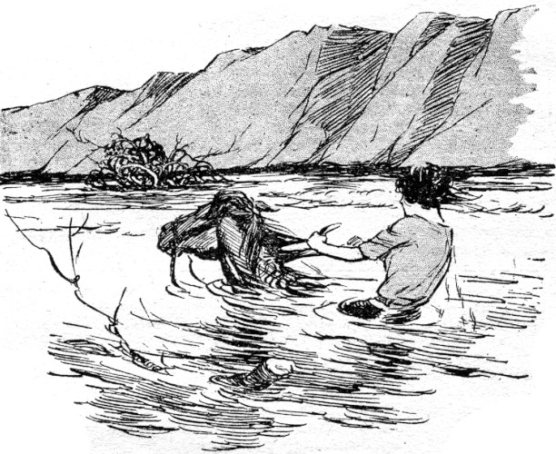 As if enraged at the pollution, the water, with a mighty surge, swept over the island, washing onto Dolly, who lay on the ground. Randy splashed to where the little puncher lay, and caught him up.