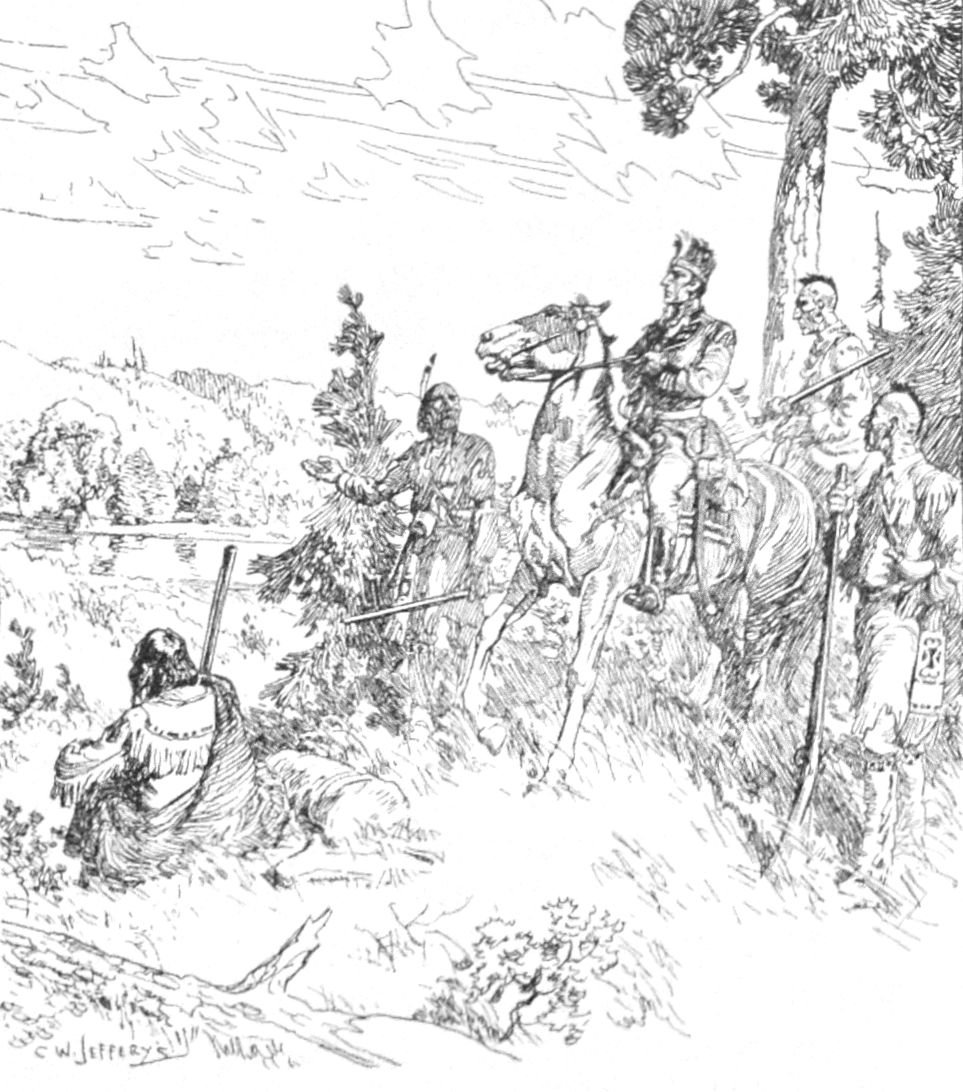 In 1778, Brant operated in the valley of the Susquehanna. He was invariably successful and the mere mention of his name caused terror to the inhabitants of the region. One of his captives, Captain Jeremiah Snyder, gives a striking pen picture of him: “A likely fellow of a fierce aspect, tall and rather spare . . . He wore moccasins, elegantly trimmed with beads—leggings and breech-cloth of superfine blue—short green coat, with two silver epaulets, and a small, laced, round hat. By his side hung an elegant silver-mounted cutlass, and his blanket of blue cloth, purposely dropped on the chair in which he sat, to display his epaulets, was gorgeously decorated with border of red.”