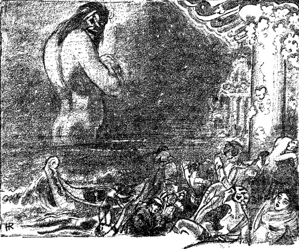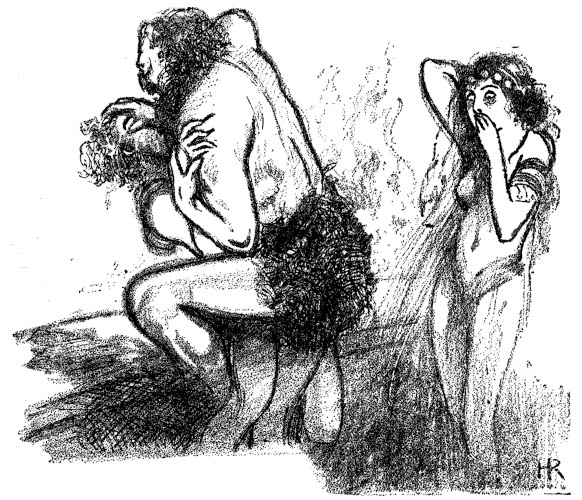 Leela, sickened, covered her face with her hands. She heard Rokk's gloating voice, "You see—my solution? Look, little white woman! Make your heart stout, like Rokk's. This is the law of life. Some live, some die. We—you and I—will live, for love, when this blood-red day is over."