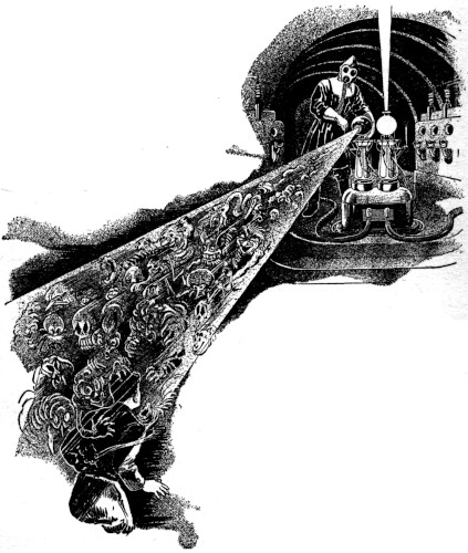 It was late in the afternoon of August 15 before the frantic chemists in the government laboratories at Miami could assemble the purple globe and begin the broadcasting of its healing waves. All that evening they were flung out into the ether. The radio was again working—though badly, because the purple vibrations also interfered with it. The world was assured by radio that the danger was over—the Red Madness in a few hours would be gone.