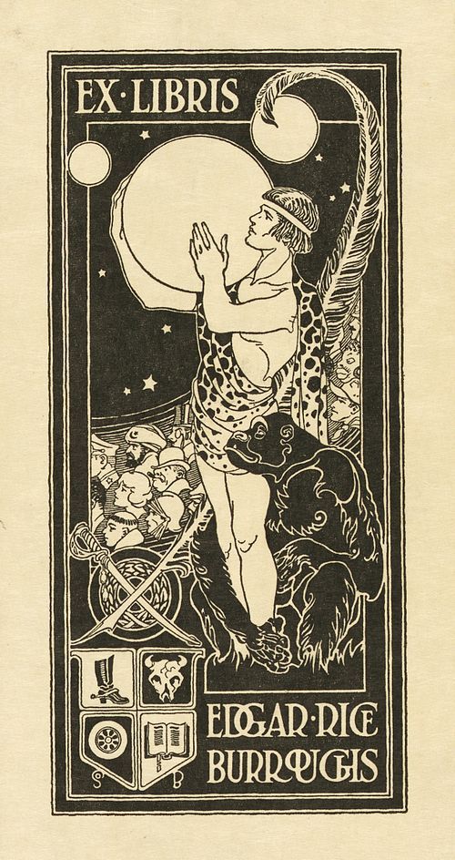 On September 1, we celebrate the birthday of Edgar Rice Burroughs (1875-1950), an American writer of science fiction, fantasy, westerns, and modern fiction. He is best known for his creations of the jungle hero Tarzan, the Mars adventurer John Carter, and the Venus adventurer Carson Napier. The image accompanying this article shows the author’s personal bookplate designed by his nephew, featuring Tarzan holding Mars, surrounded by other characters from his stories.
