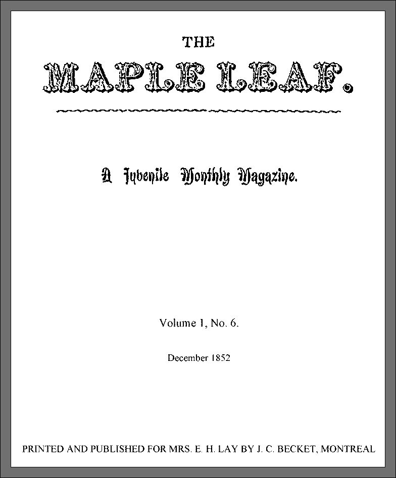| Description: | The Maple Leaf was a Canadian juvenile monthly magazine published from July 1852 to December 1854. It was the second juvenile magazine published in Canada and was written for both boys and girls and their families. In all, a total of 30 issues were published. [Suggest a different description.] |