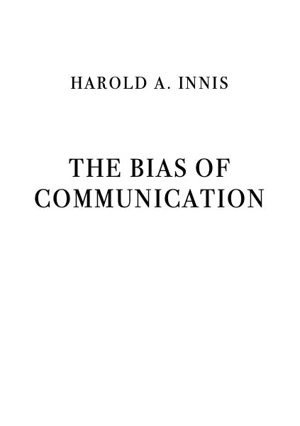| Description: | Innis explores the role of media in shaping the culture and development of civilizations. He argued that a balance between oral and written forms of communication contributed to the flourishing of Greek civilization in the 5th century BC. But he warned that Western civilization is now imperiled by powerful, advertising-driven media obsessed by "present-mindedness" and the "continuous, systematic, ruthless destruction of elements of permanence essential to cultural activity." (adapted from Wikipedia) [Suggest a different description.] |